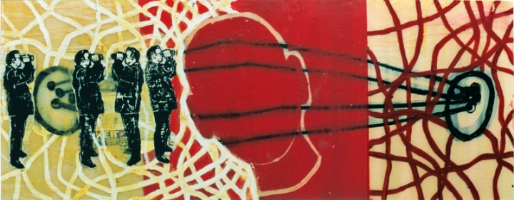 Aus der Serie “Unter Beobachtung”, seit 2021, Malerei auf Baumwolle, Serie, je 100×50cm